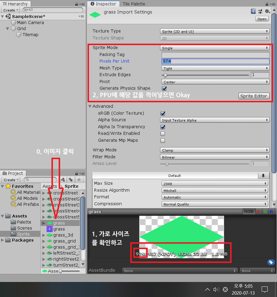 쉽게 말해, 유니티에서 타일 한칸(1유닛)이 얼마만큼의 픽셀을 표현할지에 대해적절한 값이 설정되지 않았기 때문이다.