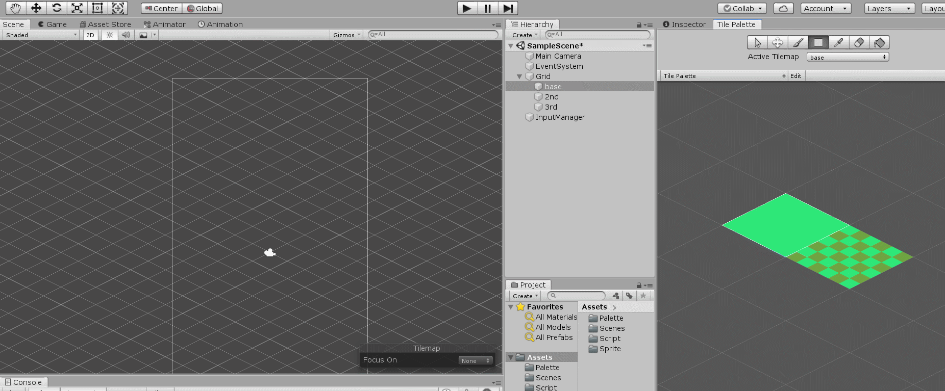 Window - 2D - Tile Pallette를 선택해 타일 팔레트 창을 열어주자.