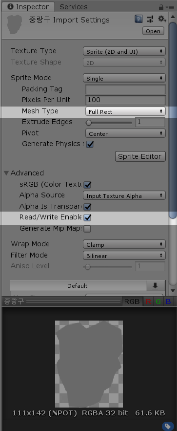 3. 해당 원본 이미지의 Import Setting에서 Mesh Type을 Full Rect로 바꾸고, Read/Write Enable을 체크한다.